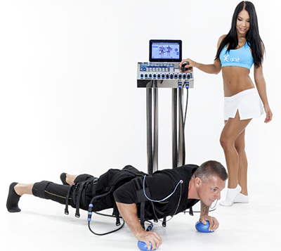 - Ανάλογα με το σχεδιασμό της προπόνησης, πέραν του ειδικού γιλέκου και σορτς, φοράμε και τους ειδικούς ιμάντες-ηλεκτρόδια για δικέφαλο/τρικέφαλο και γαστροκνήμιο που συνδέονται με τη συσκευή.